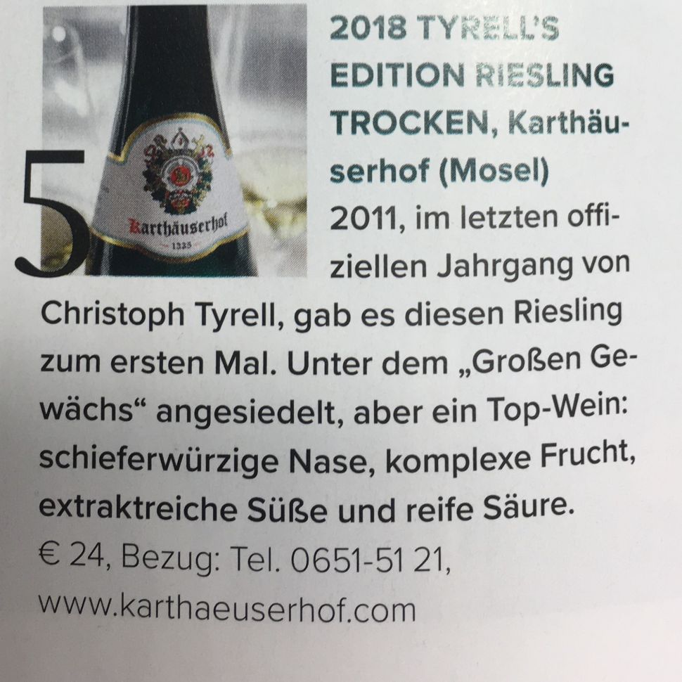 2018 Karthäuserhof „Tyrell´s Edition“ Riesling trocken belegt Platz 5 beim aktuellen DER FEINSCHMECKER Riesling Cup 2020!